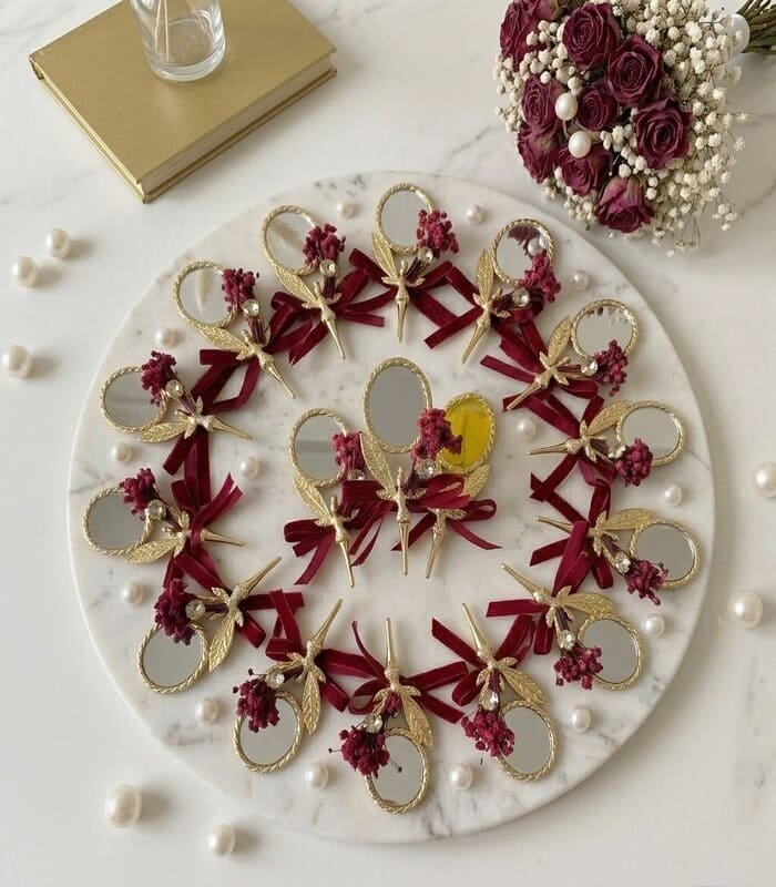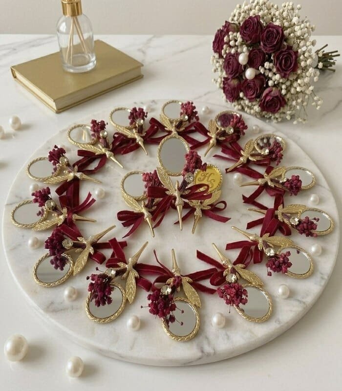 مرايا يد صغيرة بتصميم راقي، مزينة بزهور مجففة وشرائط أنيقة تضيف لمسة فخامة مميزة. مثالية كتوزيعات للمناسبات مثل الزفاف، الخطوبة، وأعياد الميلاد، مع إمكانية التخصيص حسب الألوان والتفاصيل المطلوبة. حجم عملي وسهل الحمل يجعلها هدية أنيقة ومفيدة في نفس الوقت.
