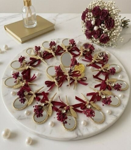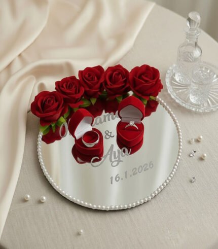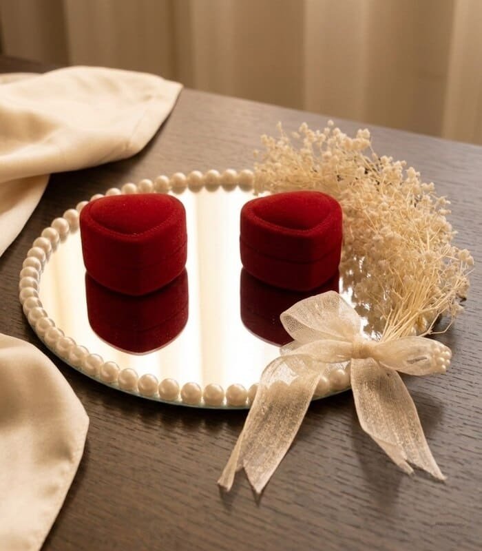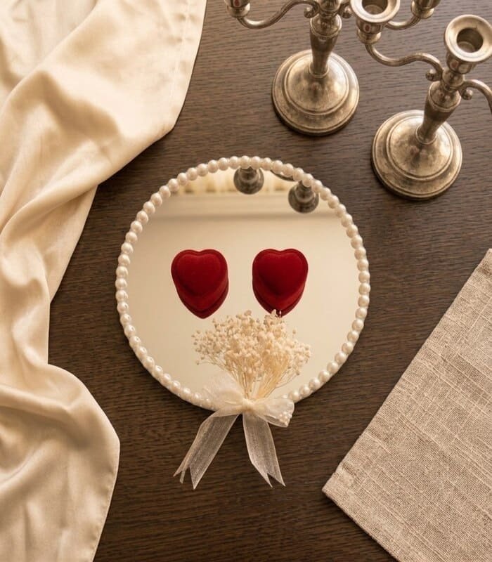 ستاند محابس بتصميم قلب مع قاعدة مرايا وتفاصيل لؤلؤية أنيقة، مثالي لعرض خواتم الخطوبة والتصوير بأسلوب راقٍ.