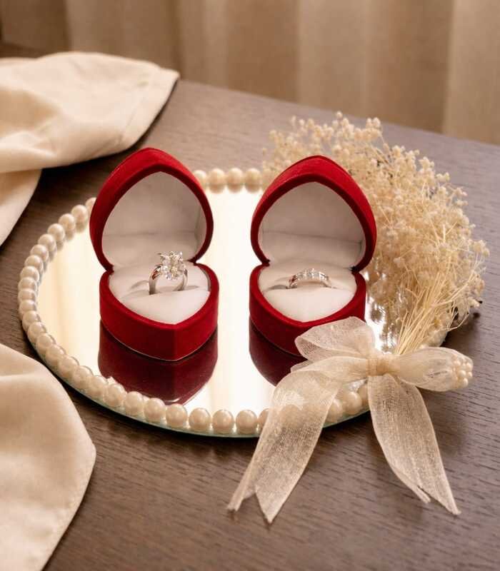 طقم خواتم بتصميم مخملي فاخر تضيف لمسة أنيقة عند تقديم الخاتم. مناسبة للخطوبة، الزواج والهدايا، مع حجم عملي يحافظ على الخاتم ويبرز جماله بشكل مميز.